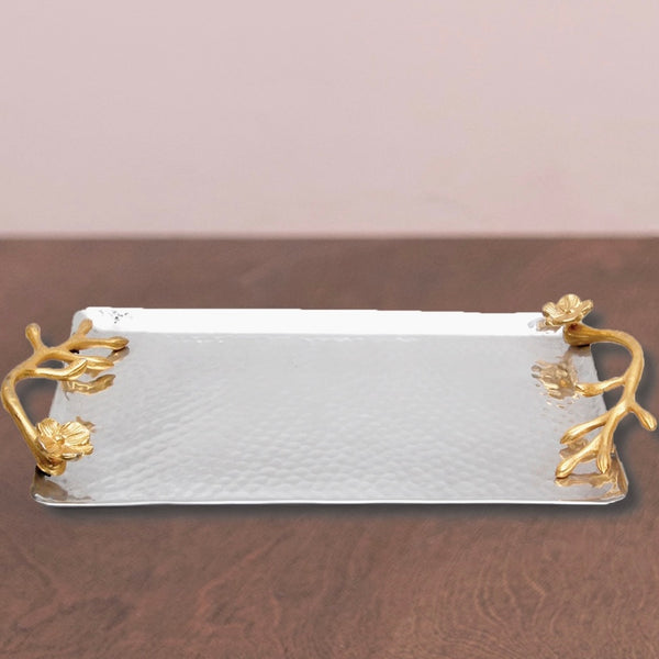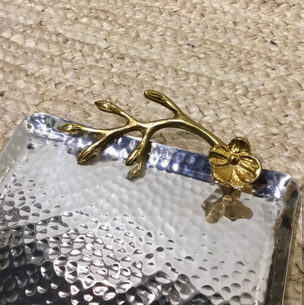 The Gilded Flower Handle Tray is a stunning addition to any home decor. Crafted with precision and elegance, this tray is perfect for serving and displaying your favorite dishes and beverages. Made from high-quality aluminum, it features a hammered texture that adds a touch of sophistication. The tray is adorned with a beautiful gold finish, giving it a luxurious and opulent look. The unique flower handle design adds a whimsical touch to this already exquisite piece.