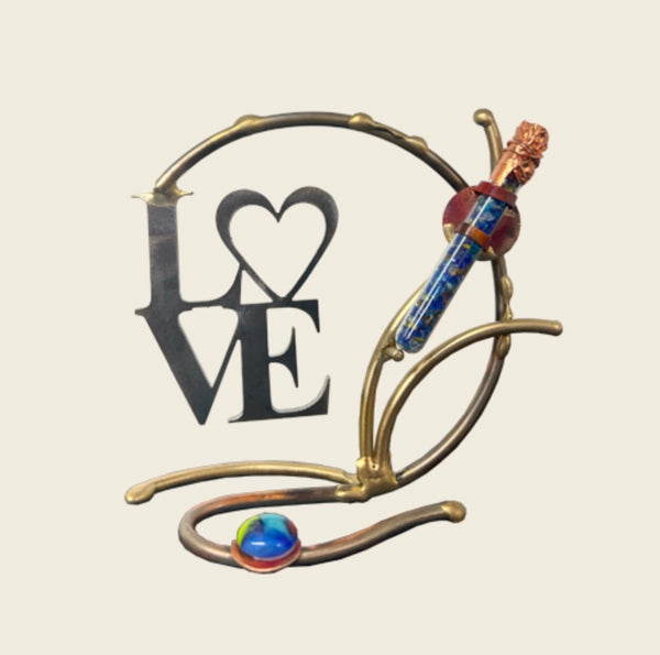 A lasercut “LOVE”, glass bead, and shards tube held together by intertwined brass rods. A lovely keepsake!