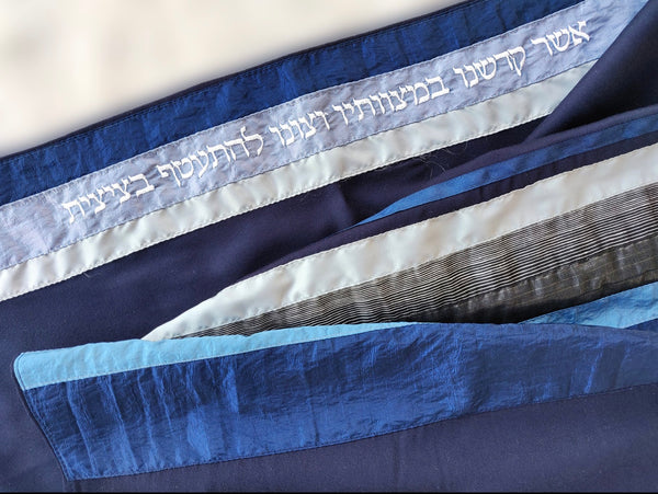 The Elegant Gabrieli navy Tallit is beautifully crafted from viscose.. Light weight, modern and handmade, this collection is supremely stylish. Each tallit is adorned with an atara (collar) that contains the prayer for donning a tallit.