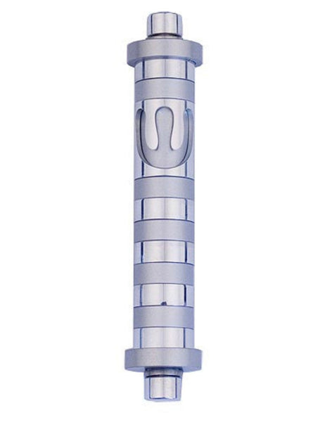 The elegant, complementary hues in this round Mezuzah case by Agayof give a modern twist to this most traditional item. Style and tradition are combined in this Mezuzah, with its cylindrical silver and anodized aluminum case.  Made in the Agayof studio in Israel. 4” H